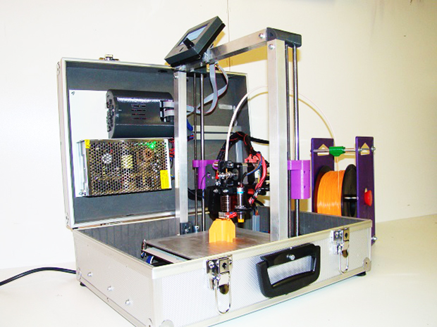 カメラなどの運搬に使われるような、アルミ製のアタッシェアタッシュケースのサイズは340×460×150mm 。3Dプリンタとして使用する際のサイズは550×400×500mmになる。使用できるフィラメントは1.75mmのPLA/ABSだけでなく、フレキシブル素材など260度未満でプリント可能なものであれば対応するという。最大造形サイズは200×160×200mm、最小積層ピッチは100μmm、最高プリント速度は毎秒140mm。オートレベリング機能を備え、わずらわしい水平合わせを自動化している。オープンソースであり、ディスプレイやSDカードスロットも備え、将来の拡張性に考慮した設計となっている。